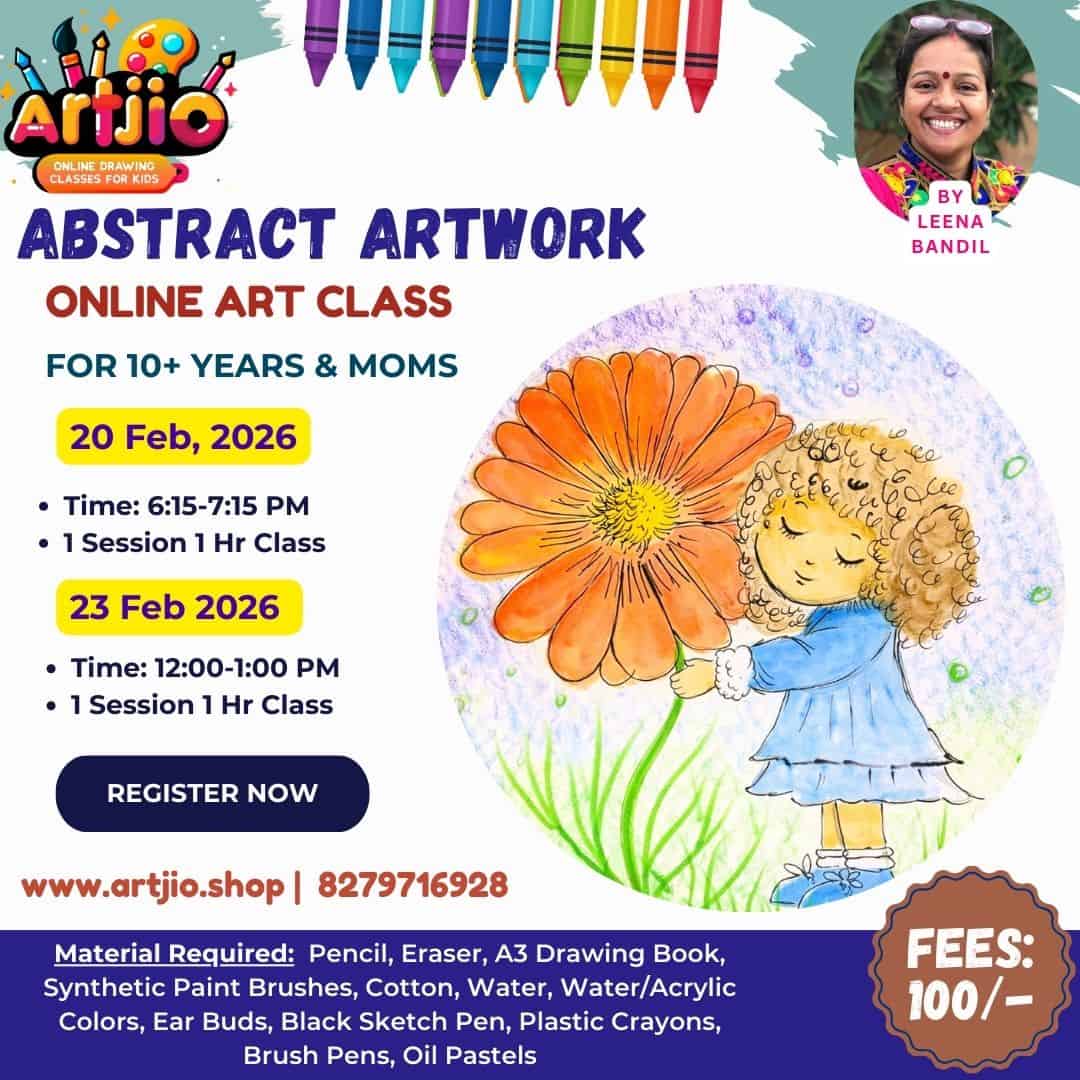 Specially designed for 10+ years students and moms, this beautiful Abstract Artwork session encourages participants to express emotions, creativity, and imagination through colours and meaningful composition. In this guided online class, you will learn step by step how to create a soft blended background, detailed floral elements, and expressive character art while understanding balance and colour harmony. This relaxing session is perfect for teens and moms who love thoughtful and expressive artwork. (Artwork shown in the poster is for reference only.)