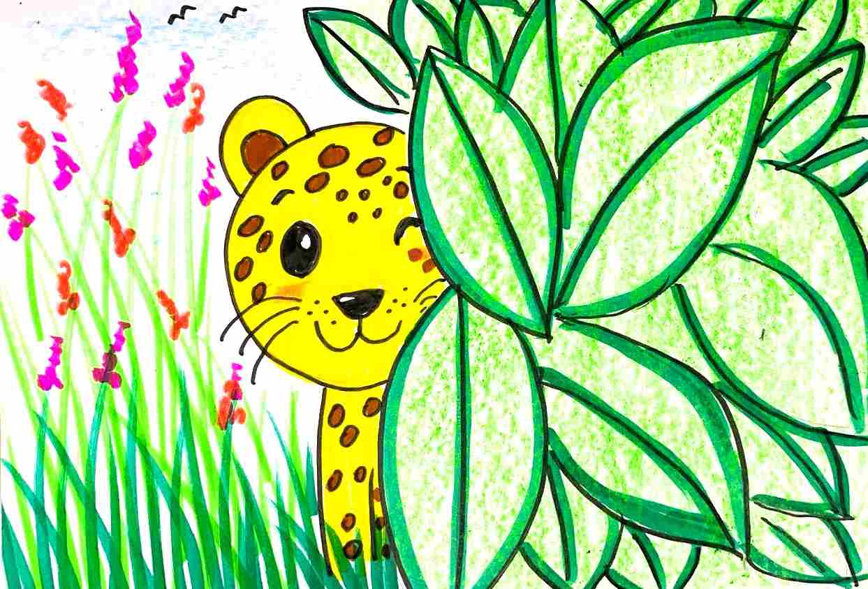 Step into the jungle with this adorable Peek-a-Boo Leopard Drawing recorded session, perfect for young artists who love animals! In this step-by-step tutorial, children learn to draw a cheerful yellow leopard peeking out from behind big green leaves. They explore how to create expressive animal features, cute spots, and smooth outlines that bring the leopard to life. The background includes colourful wildflowers, tall grass, and flying birds, making the scene bright and exciting. Kids also learn simple shading with crayons and smooth colour filling using markers. This session helps improve observation, hand control, and creativity while allowing children to enjoy drawing a playful jungle-themed artwork. A fun and confidence-boosting class that kids will absolutely love!