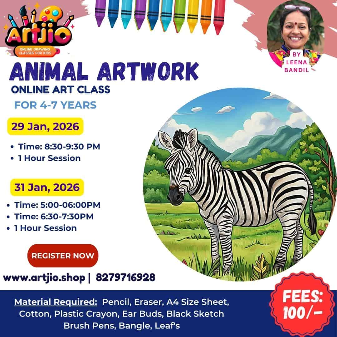 π¦ Designed for 4β7 years, this fun and engaging Animal Artwork β Zebra Painting online art class introduces young kids to animals, nature, and basic drawing techniques in a simple and joyful way. Children will learn to create a cute zebra artwork step by step while improving imagination, colour sense, and hand control. The artwork shown in the poster is for reference only.