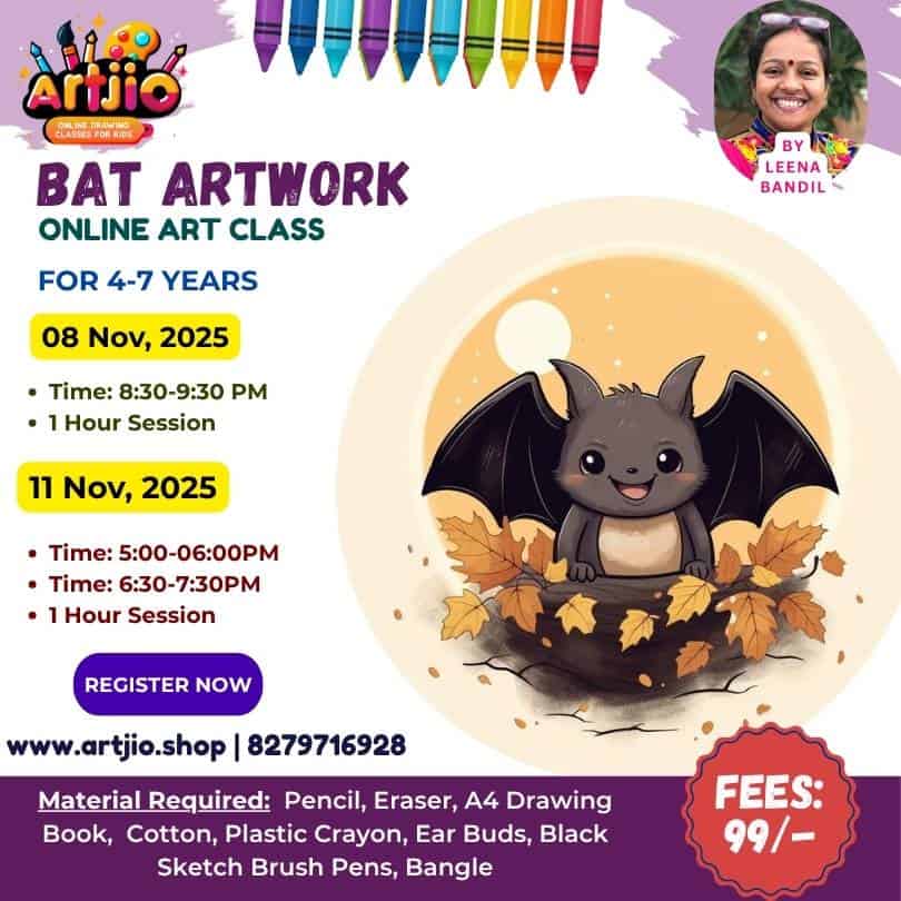 ✨Specially designed for kids aged 4–7 years, this one-hour class turns a mysterious bat into a cute and friendly character — making art exciting, creative, and full of imagination.