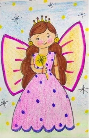 This artwork features a cheerful fairy princess with long, wavy brown hair and a golden crown adorned with tiny jewels. She has a sweet smile, rosy cheeks, and bright eyes. She wears a beautiful pink dress decorated with purple polka dots and scalloped edges at the bottom. Her magical wings are outlined in pink and filled with soft yellow. She holds a sparkling golden wand, ready to spread magic. The background is light blue with twinkling stars and tiny yellow dots, creating a dreamy atmosphere. This enchanting fairy is perfect for young children who love magical stories and fairy tales.