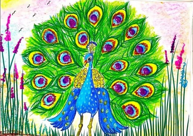 This stunning drawing features a majestic peacock standing proudly with its feathers fully fanned out. The peacock’s body is painted in shades of blue with golden-yellow accents on its wings and a delicate crest on its head. Its long, elegant legs support its graceful stance. The feathers are rich green, decorated with vibrant eye patterns in deep purple, blue, yellow, and red, creating a mesmerizing effect. The background showcases a natural setting with tall green grass and blooming flowers in pink and purple. Soft pastel hues in the sky, along with tiny flying birds, add a dreamy and peaceful atmosphere.