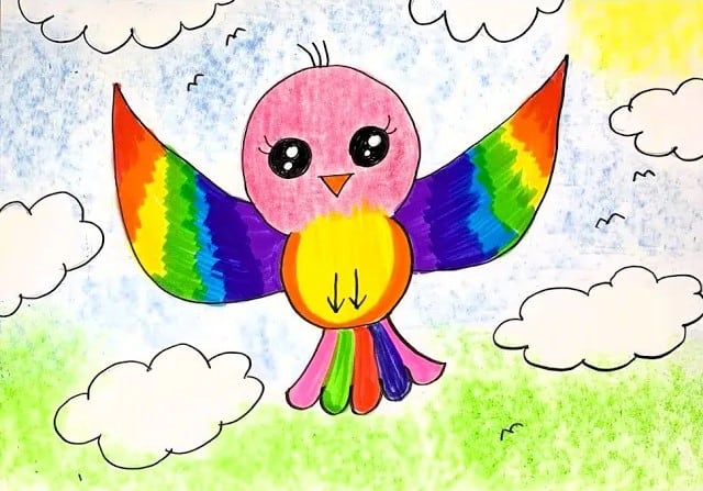 This vibrant artwork showcases a joyful rainbow bird flying freely across a bright, dreamy sky. The bird’s soft pink face, sparkling expressive eyes, and tiny beak give it an adorable and friendly look. Its wide wings are beautifully filled with rainbow shades, creating a stunning blend of colours that symbolize happiness and positivity. The colourful tail feathers add extra charm and movement to the composition. Fluffy white clouds, distant flying birds, and a glowing sun complete the cheerful background. Through this activity, children learn symmetry in wings, colour blending, neat outlining, and creative detailing. A lively masterpiece that celebrates imagination, freedom, and the beauty of colours. 🌈🐦✨
