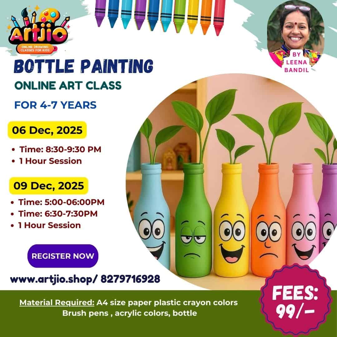 šŸŽØ Bottle Painting – Online Art Class for 4–7 YearsnnLet your little one enjoy a colourful, creative experience with Leena Bandil Ma’am’s Bottle Painting Online Art Workshop! 🌈✨