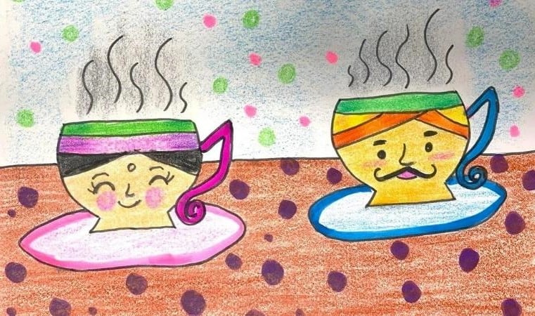 This artwork features two creatively designed tea cups with human-like faces, giving them a fun and friendly appearance. The cup on the left represents a smiling lady with rosy cheeks, long eyelashes, a small bindi, and black hair with a green and pink headband. The cup on the right represents a man with a mustache, a pink smile, and a turban in shades of orange and yellow. Both cups have curved handles and are placed on colorful saucers. Steam rises from the cups, indicating hot tea. The background is lively, decorated with polka dots and a warm-toned table surface.