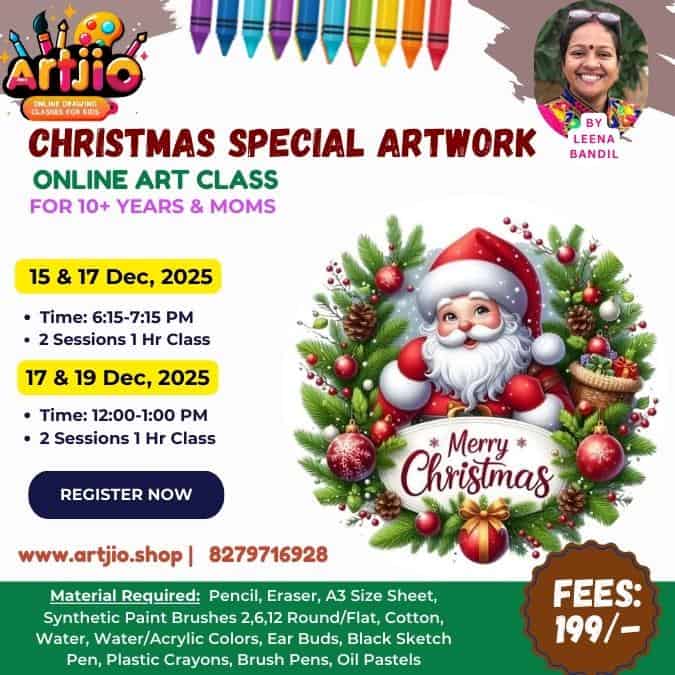 Designed for 10+ years & moms, this joyful and colourful Christmas-themed artwork session helps learners explore festive elements, colours, and artistic expression through a step-by-step guided process in a warm holiday vibe. The artwork shown in the poster is for reference only.