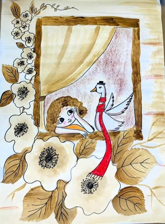This enchanting coffee painting beautifully captures a dreamy moment of wonder and warmth. The soft brown tones of coffee blend seamlessly to create a nostalgic and vintage feel, enhancing the cozy atmosphere of the artwork. A young girl gazes wistfully out of a wooden-framed window, lost in thought, while a charmingly dressed goose, adorned with a red scarf and tiny hat, seems to share in her quiet contemplation. Delicate floral elements intertwine gracefully around the scene, adding depth and elegance. The subtle shading and fine details make this artwork a perfect fusion of imagination and artistry, evoking feelings of warmth and curiosity.