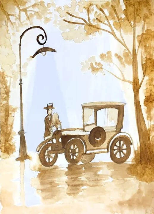 This elegant sepia-toned artwork beautifully captures a nostalgic moment from a bygone era. The vintage car, softly painted with coffee or wash techniques, stands quietly under a classic street lamp, evoking timeless charm and old-world grace. The subtle silhouettes of trees and gentle light reflections on the ground add depth and mood to the composition. Muted brown shades and fluid brush strokes create a calm, dreamy atmosphere, allowing the viewer to feel the stillness of the scene. The presence of the driver adds a human touch, enhancing the storytelling element. Overall, this artwork reflects patience, observation, and artistic maturity, showcasing how minimal colours and soft tones can powerfully express history, mood, and emotion.