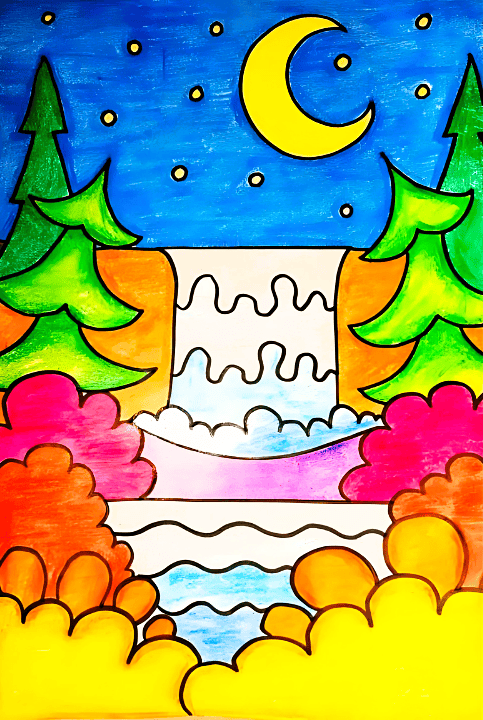 In this 2-hour pre-recorded session, young artists (ages 4-7) will create a beautiful night waterfall scene with a shimmering moon, twinkling stars, and colorful trees! 🌙🌲 Using simple shapes and step-by-step guidance, kids will learn basic drawing, coloring, and shading techniques to bring this dreamy landscape to life. 🎨🌿