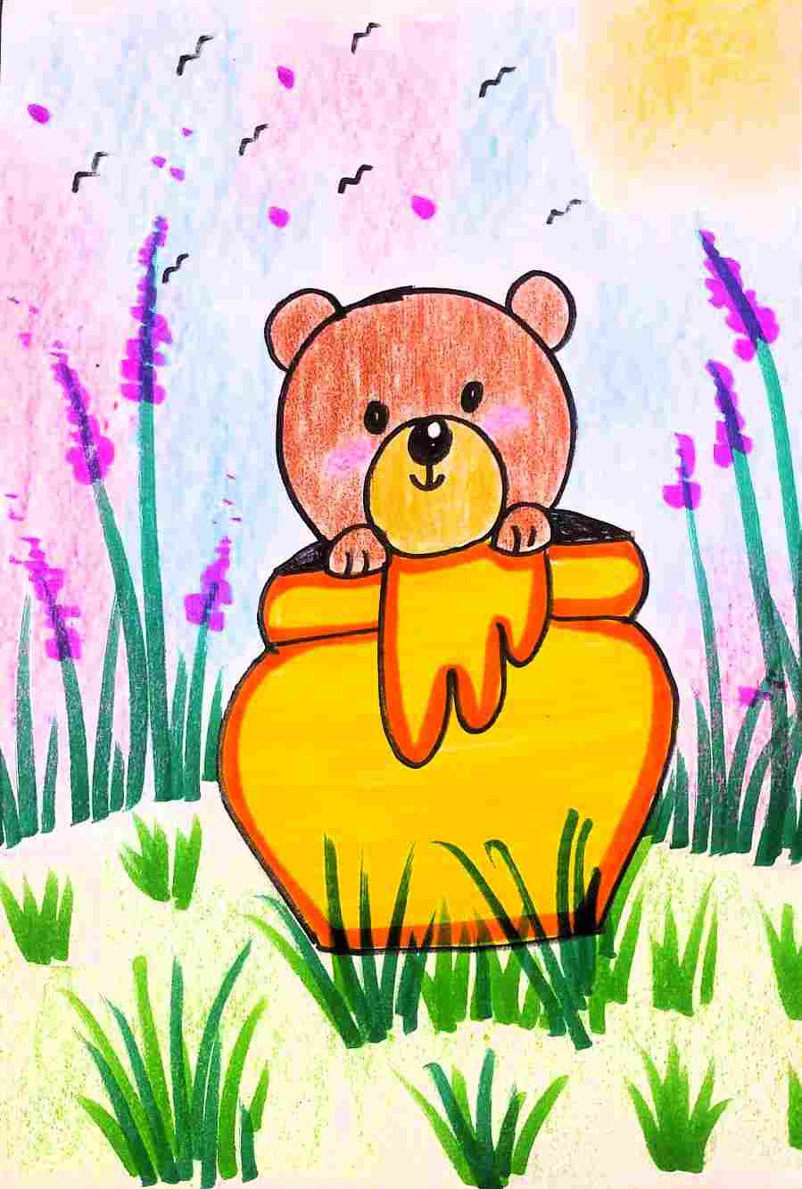In this adorable recorded session, little artists will learn to draw and color a cute bear peeking out of a honey pot! 🐻🍯 Through this fun step-by-step activity, children will explore basic shapes, outlines, and coloring techniques, helping them build fine motor skills and creative confidence. 🌈💛The cheerful background filled with sunshine, flowers, and grass adds a warm and happy touch to the artwork. 🌸🌿 Perfect for Pre-Junior artists (4–7 years), this class encourages imagination and joy while learning how to bring characters to life with colors and expressions. ✏️🎨