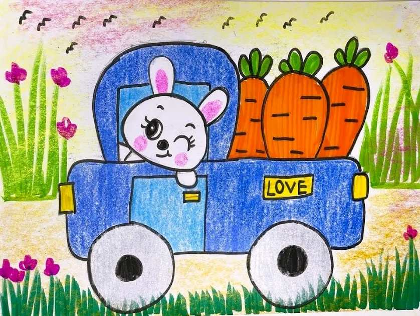 Join this adorable pre-recorded drawing session where kids will create a cute bunny driving a blue truck filled with fresh carrots! This easy and fun tutorial is designed for young artists to learn basic shapes, coloring techniques, and creative detailing. With a vibrant farm background and cheerful elements, this artwork will help children enhance their fine motor skills and artistic confidence. Perfect for animal lovers and little artists who enjoy playful, cartoon-style drawings. Let’s bring this happy bunny to life with bright colors and creativity! 🐰🚜🥕🎨