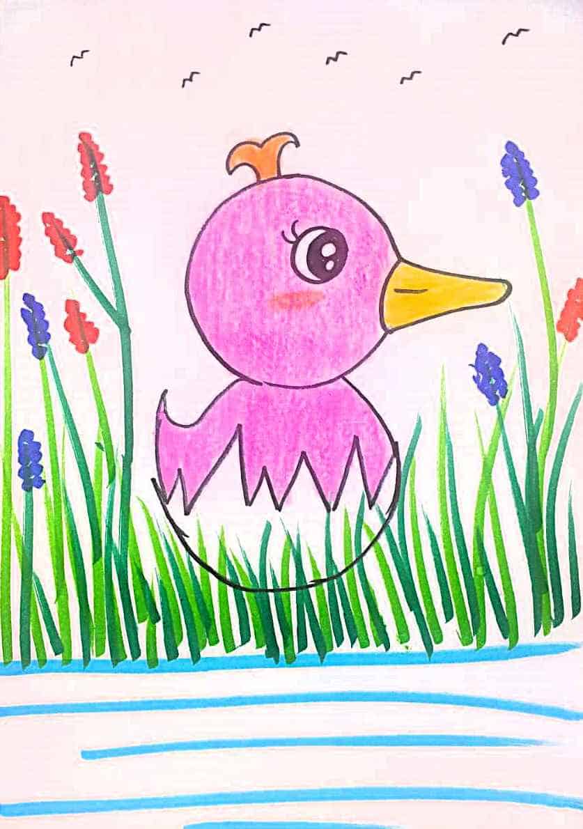 In this recorded session, children will learn to draw and color a cute little duck with a bright yellow beak and a charming pink body. The duck is shown among tall green grass and colorful flowers, making the artwork lively and full of nature’s beauty. With step-by-step guidance, kids create the duck’s round shape, feathers, and cheerful look, finishing with a playful background. 🌸💚This activity is perfect for introducing basic animal drawing, color practice, and neat outlining. It helps children improve their observation, creativity, and confidence while keeping the process simple and fun. Ideal for ages 4–7, this session is joyful, bright, and easy to follow. 🌈💖