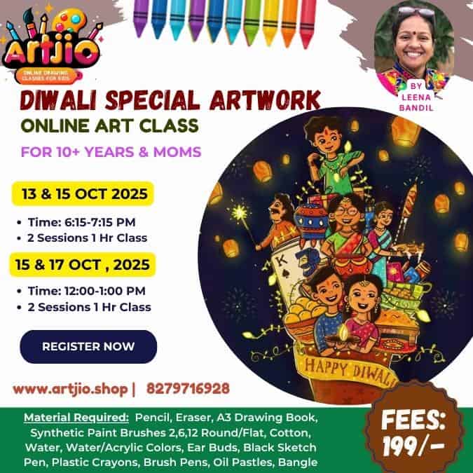 Celebrate the festival of lights with colors, creativity, and joy! This Diwali, Artjio brings you a special online art class designed exclusively for children above 10 years and mothers. Guided by Leena Bandil Ma’am, participants will learn to create a festive-themed artwork that captures the true spirit of Diwali – diyas, fireworks, sweets, decorations, and the joy of togetherness. 🎨🪔