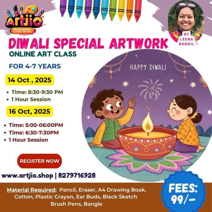This Diwali, let your little ones celebrate the festival of lights with art, fun, and colors! πŸͺ”πŸŽ¨ Artjio brings a special online art class for kids aged 4–7 years, guided by our loving mentor Leena Bandil Ma’am.