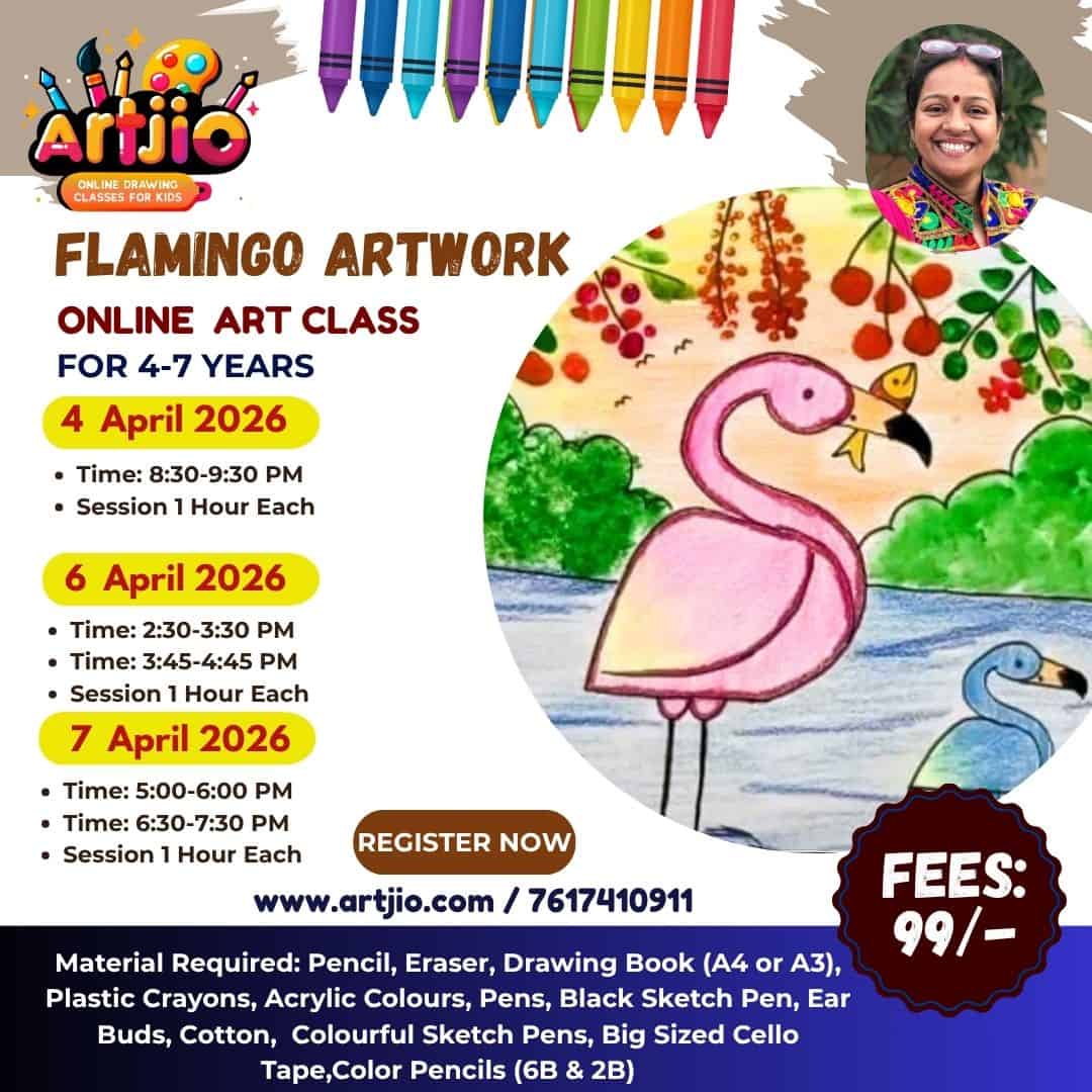 Specially designed for 4–7 years, this fun and colorful art session introduces little artists to drawing a beautiful flamingo in a natural scenery. Through a guided step-by-step process, kids will create a cute flamingo near water while exploring colours, shapes, and composition. This workshop helps children enjoy art while expressing creativity through bright and joyful elements. (Artwork shown in the poster is for reference only.)