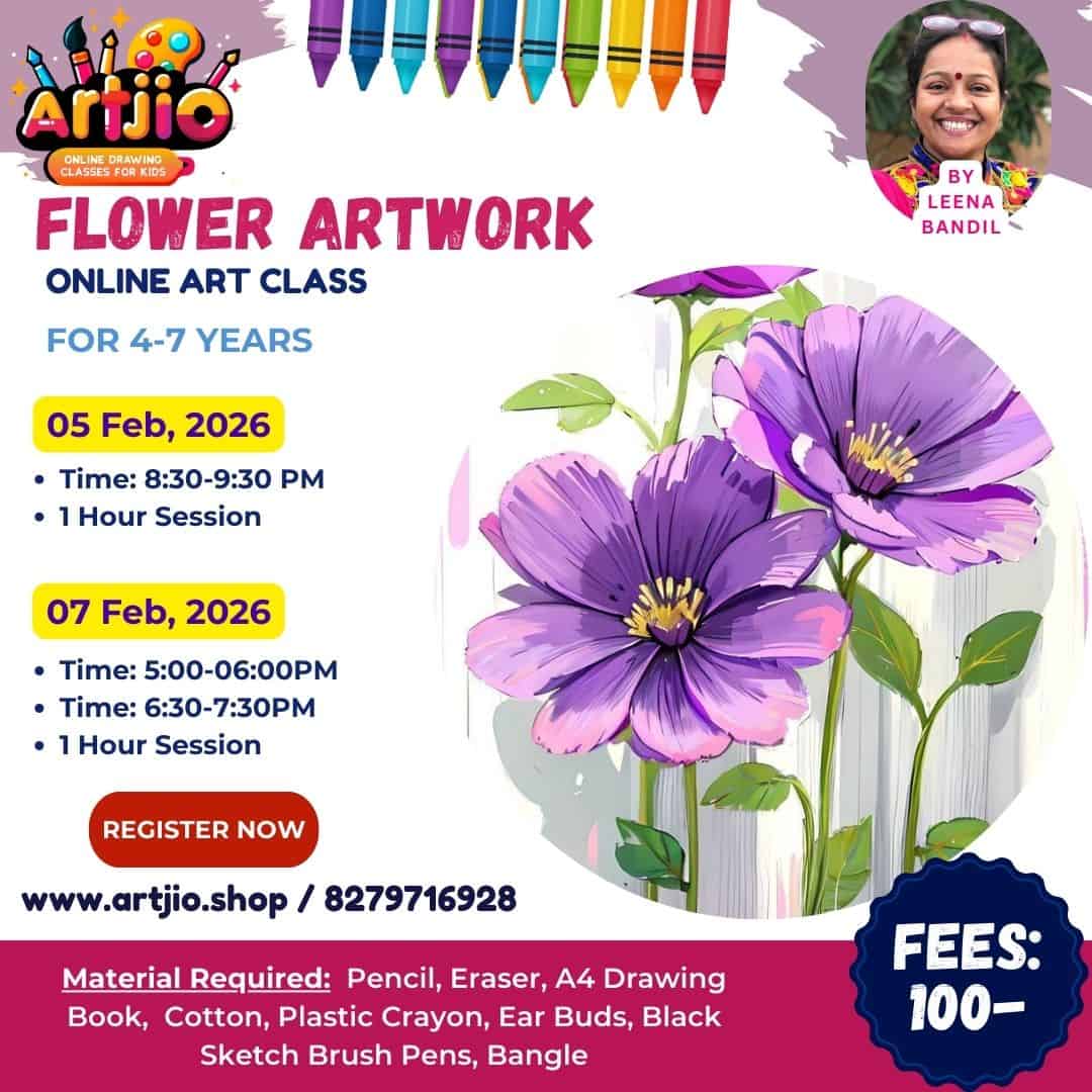 Specially designed for children aged 4–7 years, this fun and engaging Flower Artwork session introduces young kids to flowers and nature through drawing and colouring in a simple, joyful way. In this guided online class, children will learn to create a beautiful flower artwork step by step while improving colour sense, observation skills, and hand control. (Artwork shown in the poster is for reference only.)