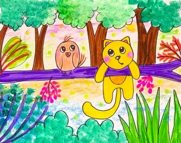 This is a colorful and cheerful drawing that is perfect for kids aged 4-7. The artwork depicts a bright forest scene with a cute yellow cat sitting on a purple tree branch, its tail curling below. The cat has big, expressive eyes and pink blush marks on its cheeks, giving it an adorable look. Next to the cat, a small round bird with tiny wings and a happy expression is perched on the same branch. The background consists of green trees with fluffy foliage, bushes, and various colorful plants. The ground is decorated with a mix of grass, leaves, and pink flowers, creating a lively and fun atmosphere. The entire scene is painted in vibrant shades, making it visually appealing and engaging for young children.