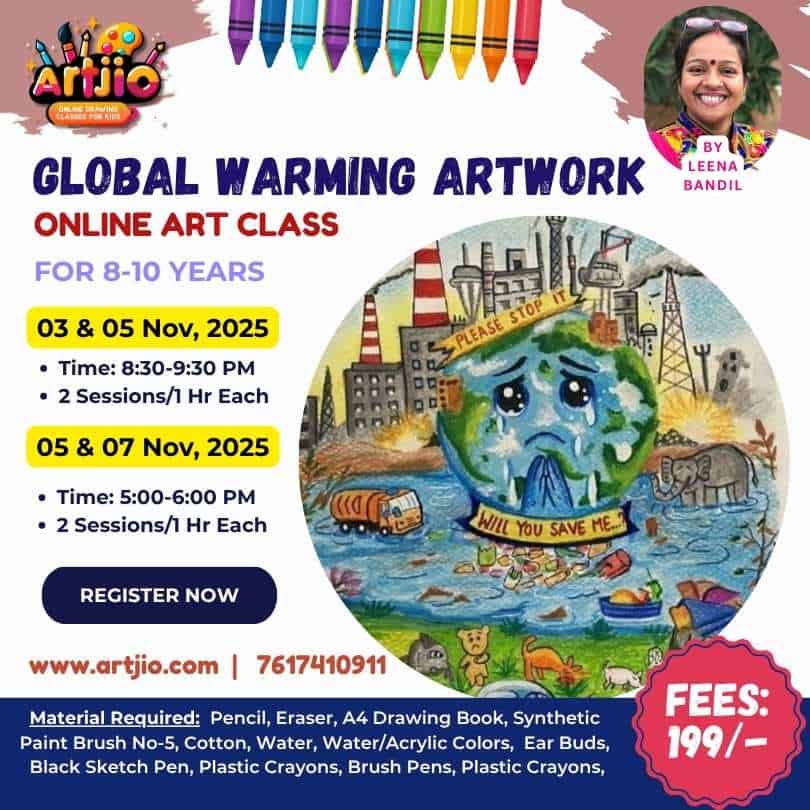 Let’s use creativity to spread awareness and make a difference! 💚 Join Leena Bandil Ma’am in this thoughtful and artistic session — “Global Warming Artwork”, designed for children aged 8–10 years. 🌈