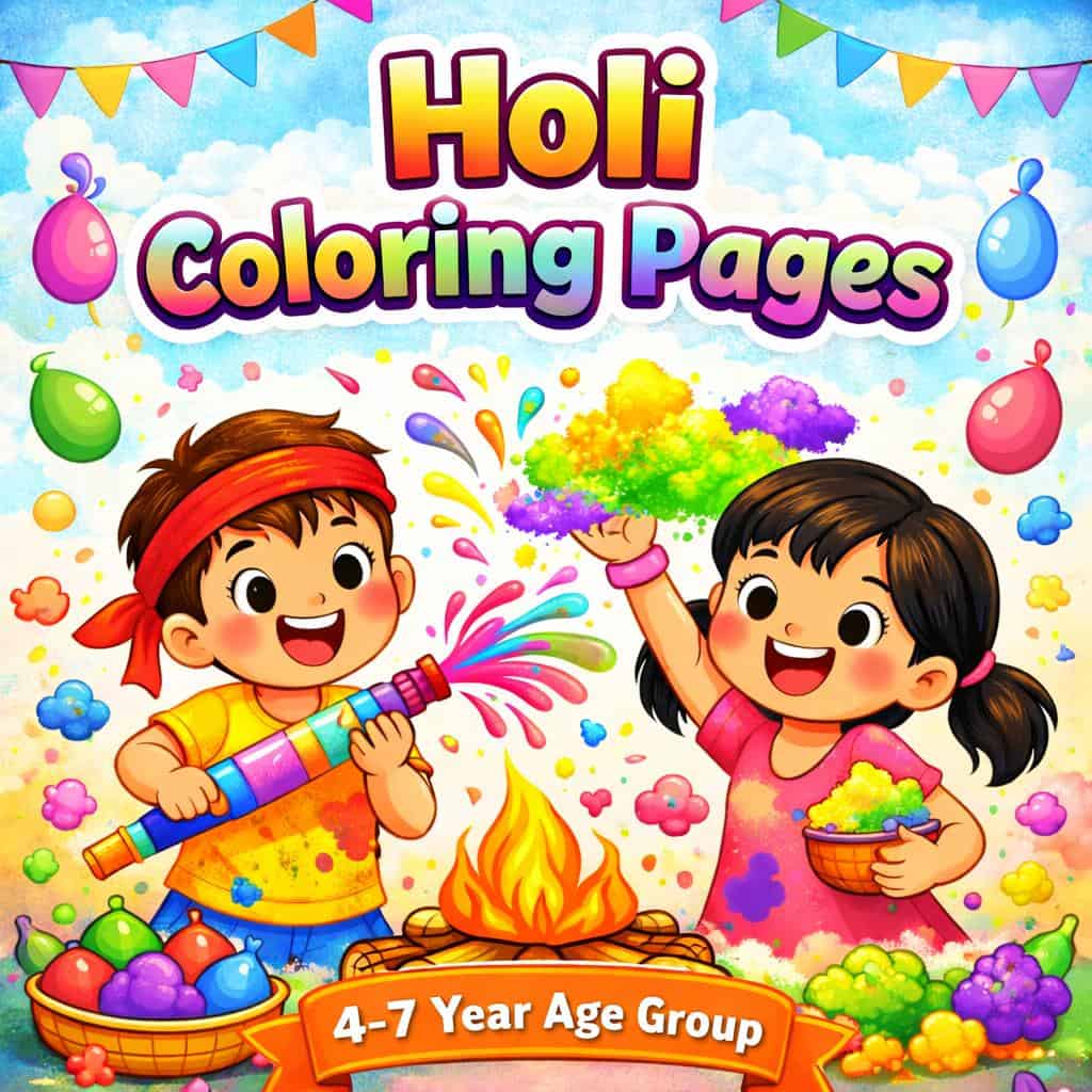 Celebrate the vibrant festival of colors with these joyful Holi Coloring Pages specially designed for children aged 4–7 years. This delightful collection features cute, playful illustrations of kids enjoying Holi with pichkaris, colorful gulal, water balloons, and festive decorations. The bright and cheerful designs inspire creativity while helping little artists explore colors in a fun and engaging way. Each page is thoughtfully created with simple, bold outlines that are perfect for young hands to color comfortably. These Holi-themed coloring sheets not only encourage artistic expression but also introduce children to the spirit of togetherness and celebration. A perfect festive activity for kids to enjoy learning and coloring at home. 🌈🎨