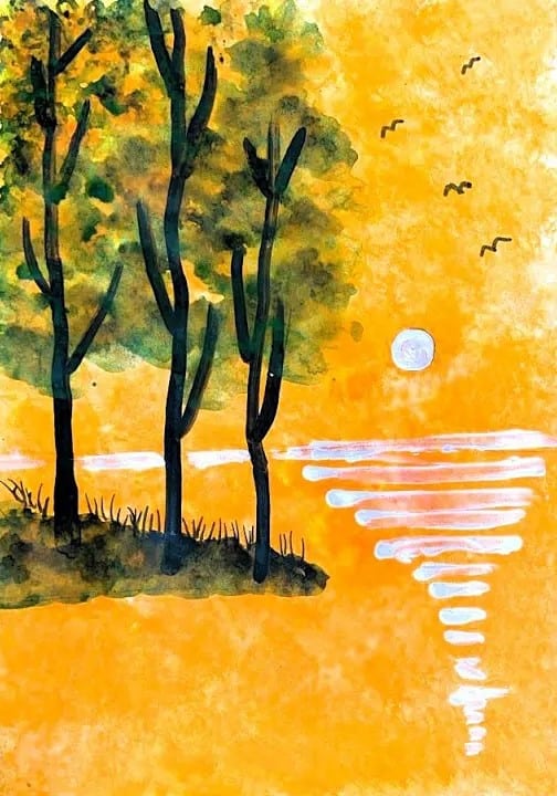 This recorded art session guides learners in creating a serene nature landscape inspired by sunset reflections. Step by step, students explore blending warm colours to form a glowing sky and soft water reflections. The session focuses on creating depth using light and shadow, simple tree silhouettes, and textured brush techniques for foliage. Learners understand how minimal elements like birds, horizon lines, and reflections can bring calmness and balance to an artwork. Perfect for kids and beginners, this session improves colour blending, brush control, and observation skills. It also encourages patience and emotional expression, helping artists connect with nature while creating a peaceful scenic painting at their own pace from the comfort of home.