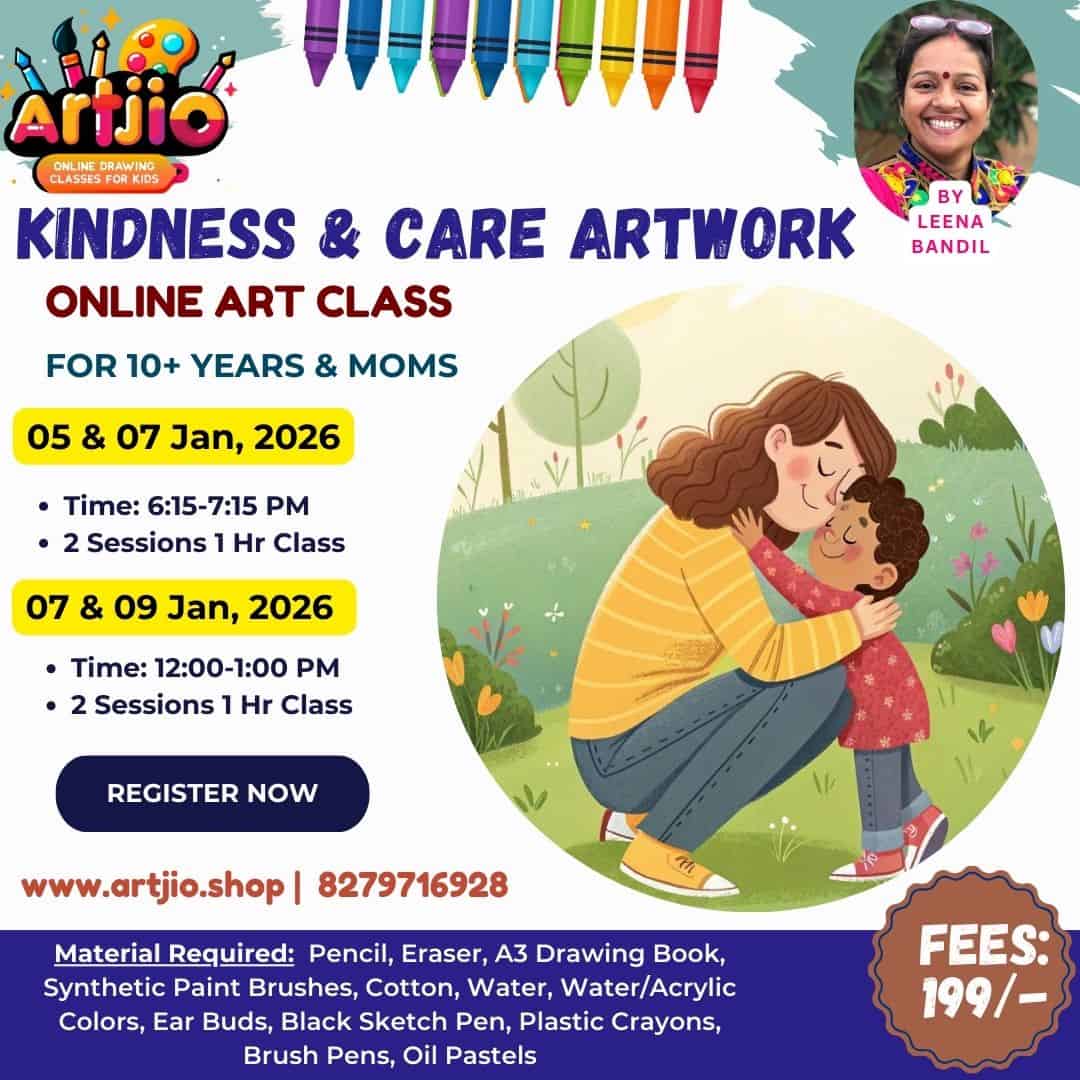 Designed for 10+ years & moms, this gentle and meaningful Kindness & Care–themed artwork session helps learners express emotions, love, and compassion through art. The session focuses on creating a heart-warming artwork using a step-by-step guided process that encourages emotional connection along with creativity. The artwork shown in the poster is for reference only.