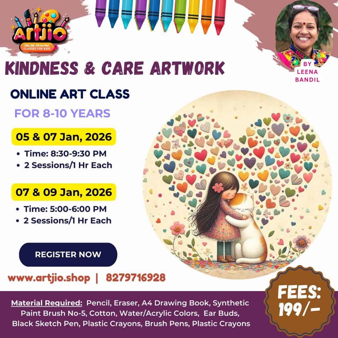 💞Specially designed for children aged 8–10 years, this heart-warming Kindness & Care art workshop helps kids express emotions like love, compassion, and empathy through creative drawing and colouring. Guided step-by-step by Leena Bandil Ma’am, children will learn how to transform feelings into meaningful artwork while enjoying a calm, positive learning experience(Artwork shown in the poster is for reference only).