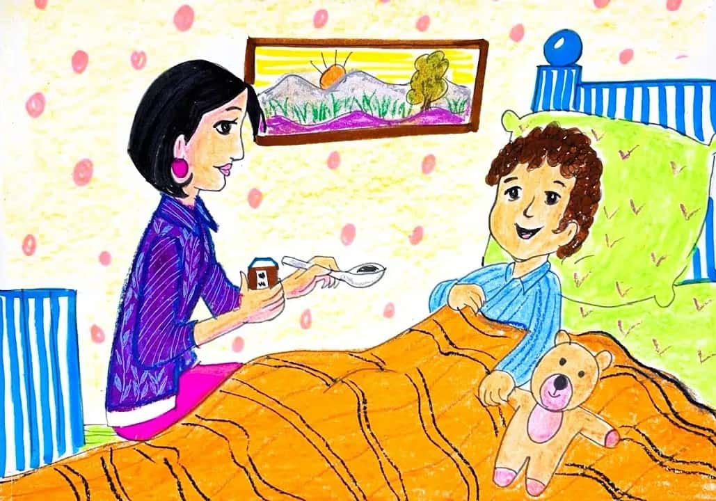 This heart-warming artwork beautifully shows a loving mom taking care of her sick child with warmth and affection. The child is resting comfortably in bed with a soft blanket and his favourite teddy by his side, while the mother gently offers him medicine with a smile. The bright colours, simple shapes, and friendly expressions make the scene comforting and relatable for young learners. The background details—polka-dot wall, framed scenery, and cosy bedroom setting—add charm and storytelling elements to the drawing.