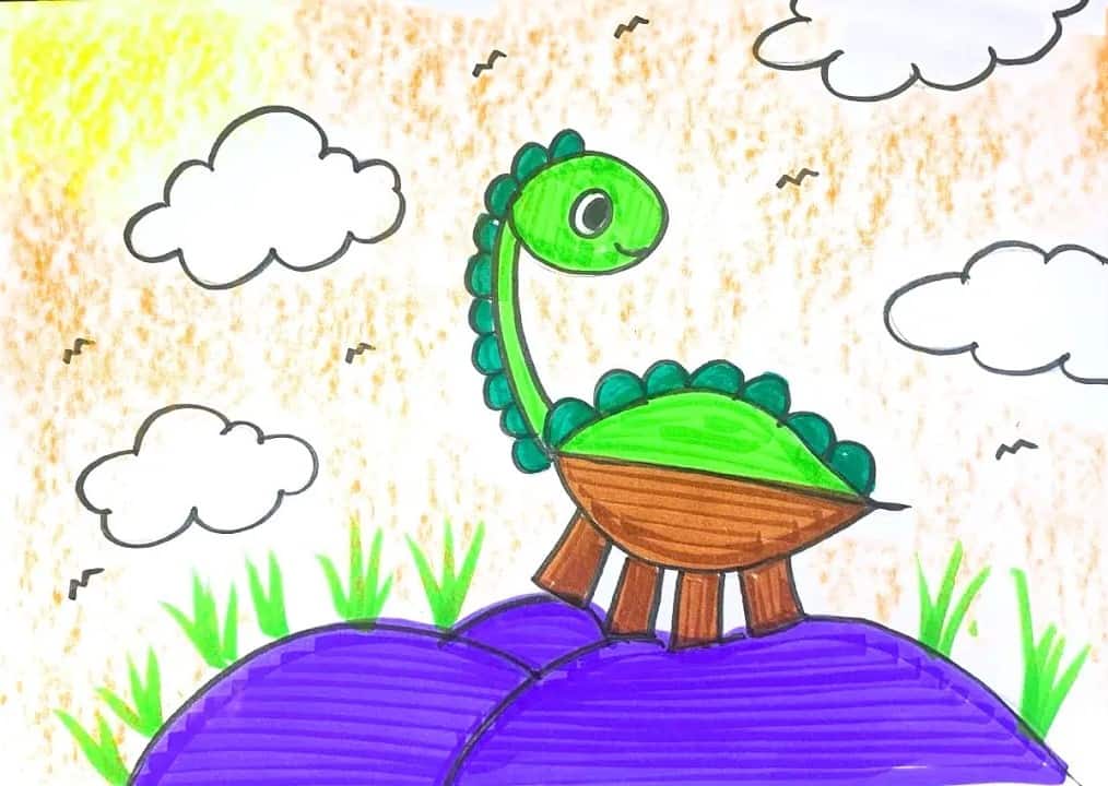 This cheerful dinosaur artwork is a delightful creation made with simple shapes, bright colours, and a child-friendly style. The cute green dinosaur stands proudly on colourful rocks, surrounded by fluffy clouds, flying birds, and fresh green grass, creating a happy outdoor scene. The use of bold outlines and vibrant shades makes the artwork lively and easy to understand for young learners. This drawing helps children explore imagination while learning basic drawing techniques like outlining, colouring neatly, and filling spaces evenly. It also encourages observation of nature elements such as sky, clouds, land, and animals. Overall, this joyful artwork boosts creativity, colour sense, confidence, and fine motor skills in a fun and engaging way.