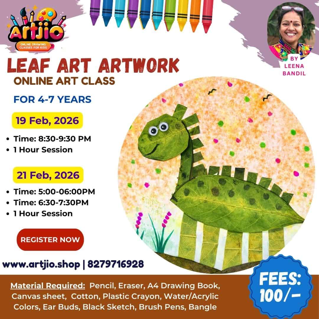 Specially designed for children aged 4–7 years, this fun and creative Leaf Art session introduces little artists to the exciting world of nature-based crafting. In this guided online class, kids will learn step by step how to create a cute dinosaur artwork using real leaves, colours, and simple tools. This activity encourages imagination, creativity, and hands-on learning while improving fine motor skills and hand coordination. (Artwork shown in the poster is for reference only.)