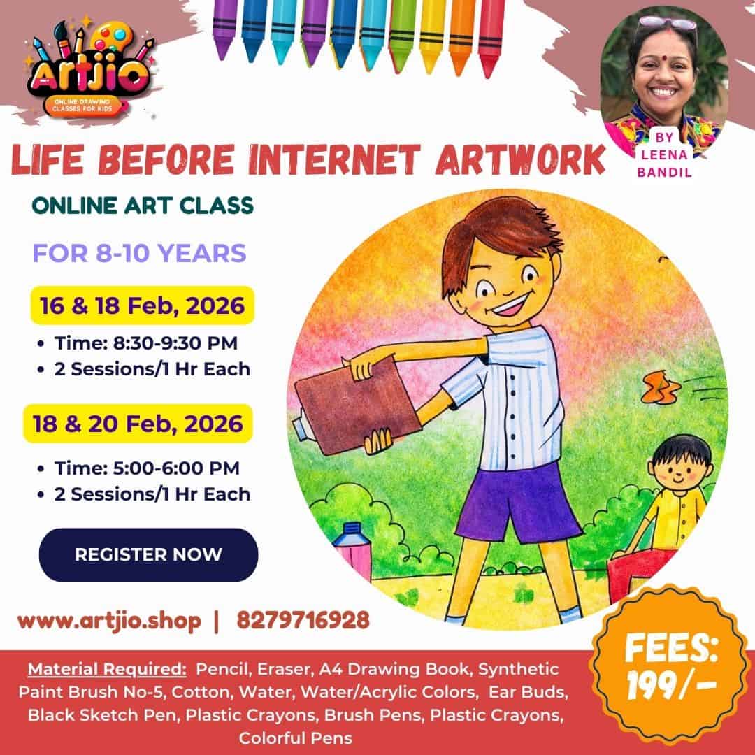 Specially designed for children aged 8–10 years, this creative Life Before Internet artwork session encourages kids to explore imagination and understand how life was enjoyed before digital gadgets. In this guided online class, children will learn step by step how to draw expressive characters, create vibrant backgrounds, and add storytelling elements to their artwork. This session helps improve observation, colouring techniques, composition skills, and creative thinking. (Artwork shown in the poster is for reference only.)