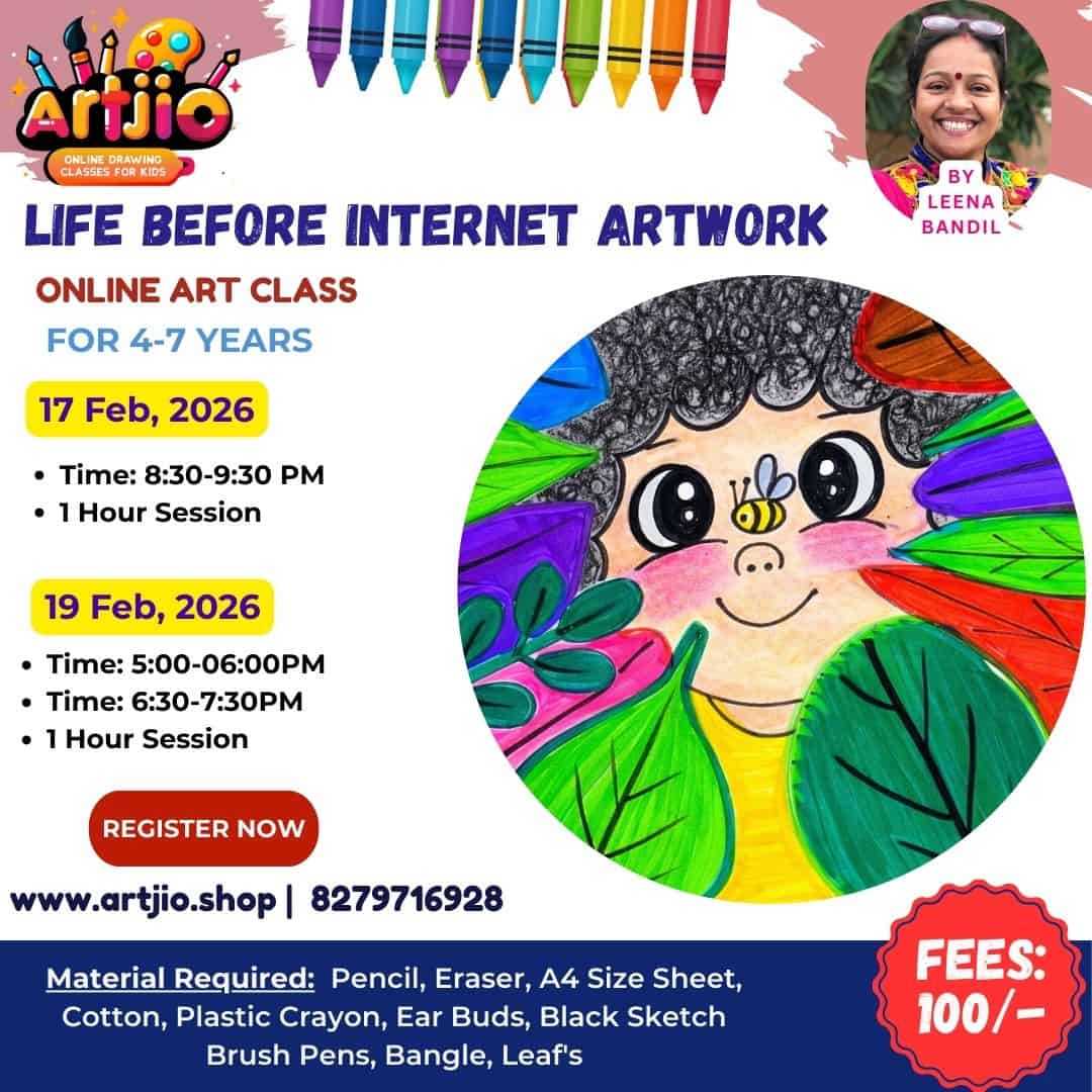 Specially designed for children aged 4–7 years, this fun and imaginative Life Before Internet artwork session helps little artists explore how kids enjoyed nature and simple joys before digital gadgets. In this guided online class, children will learn step by step how to draw a cute expressive face, colourful leaves, and playful elements while improving hand control and creativity. This beginner-friendly session focuses on colouring neatly, identifying shapes, and building confidence in young learners. (Artwork shown in the poster is for reference only.)