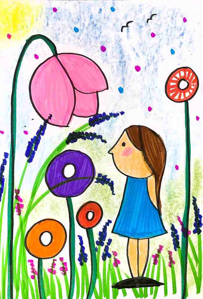 This joyful pre-recorded art session is specially designed for children aged 4–7 years, encouraging them to explore creativity through simple and colourful drawing. In this session, kids learn to draw a cute little girl standing in a beautiful garden filled with big flowers, tall grass, tiny buds, and playful sky dots.