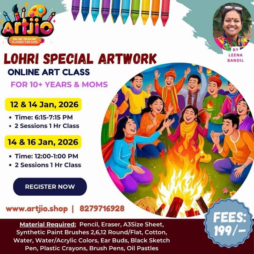 Designed for 10+ years & moms, this joyful and festive Lohri-themed artwork session helps learners explore culture, celebration, and togetherness through art. The session focuses on creating a vibrant bonfire-centered Lohri scene using a step-by-step guided process that blends creativity with cultural expression. The artwork shown in the poster is for reference only.