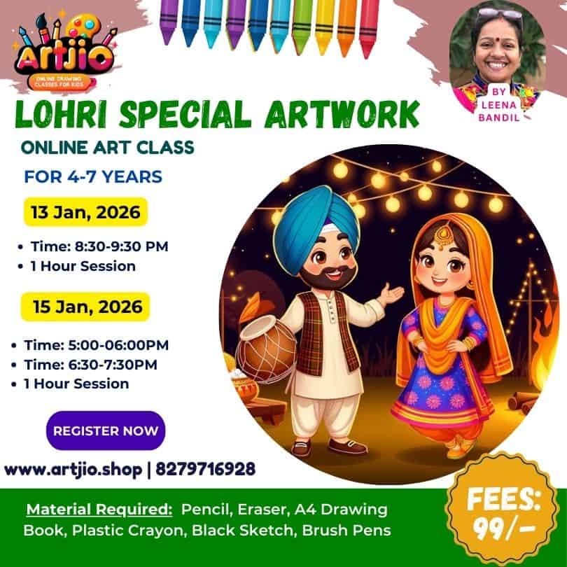 Designed for 4β7 years, this fun and festive Lohri-themed artwork session introduces young kids to colours, celebration, and creativity in a playful and easy way. Children will learn to draw a cute Lohri dance scene step by step, helping them enjoy art while exploring festival traditions. The artwork shown in the poster is for reference only.
