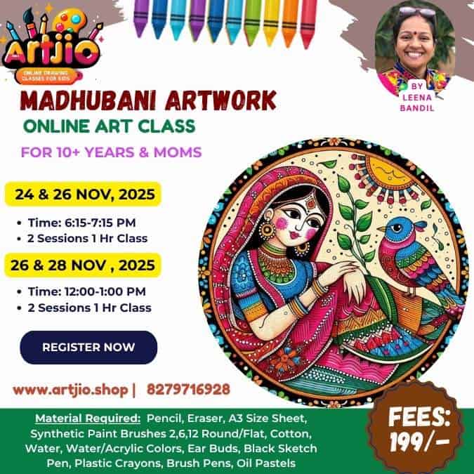 Step into the rich world of Indian traditional art with Leena Bandil Ma’am’s “Madhubani Artwork” class — a creative celebration of culture, color, and intricate beauty! 🌸✨
