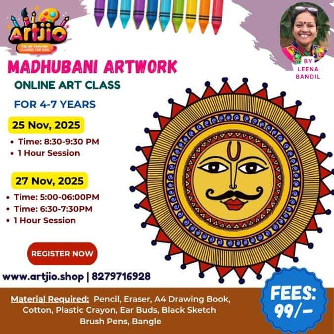 Introduce your little one to the colourful world of Indian folk art with Leena Bandil Ma’am’s special “Madhubani Artwork” class! 🌼