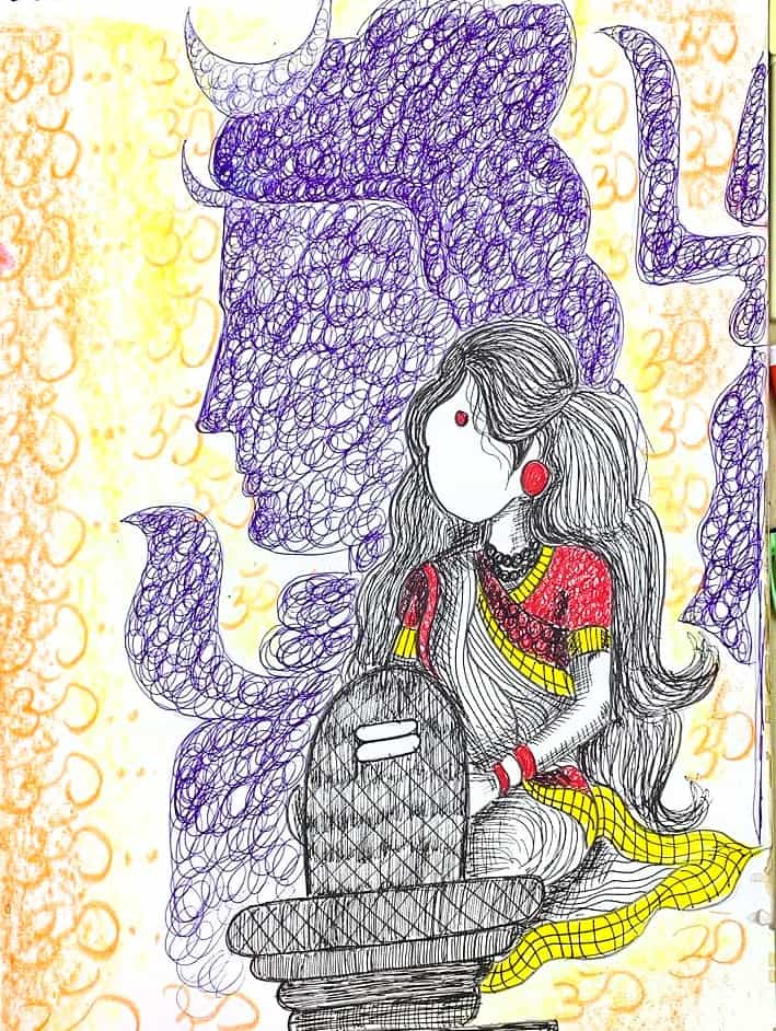 Using fine pen strokes, scribble techniques, and detailed cross-hatching, students explored depth, texture, and shading entirely through pen work. The creative use of repetitive “ॐ” patterns in the background enhances the spiritual aura of the artwork. The selective touch of colours adds vibrancy while maintaining the elegance of pen art.