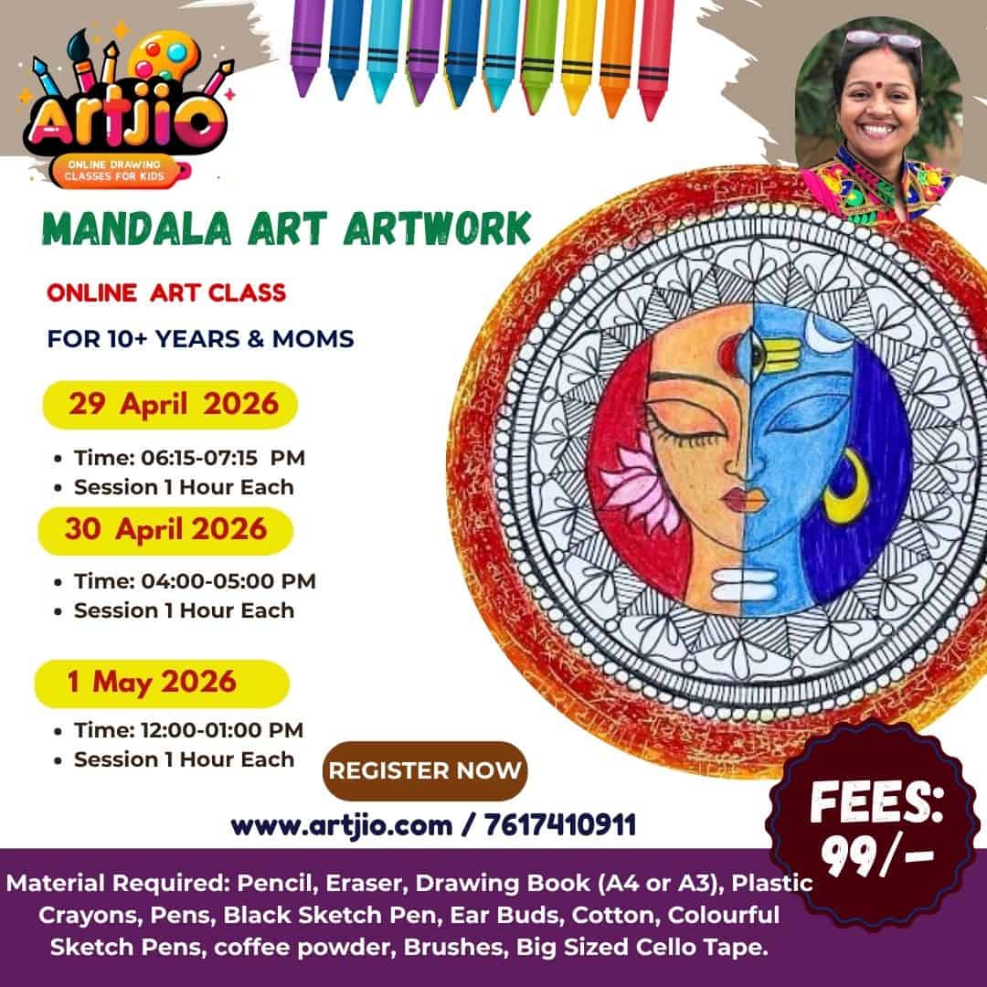 Specially designed for 10+ years & moms, this enriching and mindful art session introduces participants to the intricate beauty of Mandala Art combined with creative portrait design. In this unique workshop, learners will create a stunning half-face themed mandala artwork, blending symmetry with expressive detailing. With step-by-step guidance, participants will explore patterns, balance, and color harmony to create a visually striking masterpiece. (Artwork shown in the poster is for reference only.)