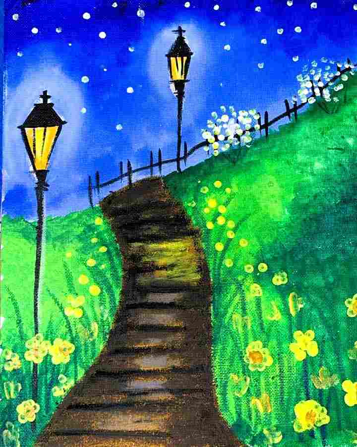 This beautiful canvas painting session is specially designed for our Senior Batch (10+ years & Moms) and focuses on creating a peaceful night landscape with depth and emotion. In this recorded session, learners are guided step by step to paint glowing street lamps, a winding pathway, soft florals, and a starry night sky using simple yet effective brush techniques.nnParticipants learn colour blending, light–shadow effects, texture creation, and perspective to bring life and calmness into the artwork. The session encourages patience, creativity, and mindful painting while helping learners gain confidence in handling canvas and colours.nnThis artwork is perfect for those who enjoy expressive, relaxing art and want to enhance their canvas painting skills with a professional yet easy approach. 🌌