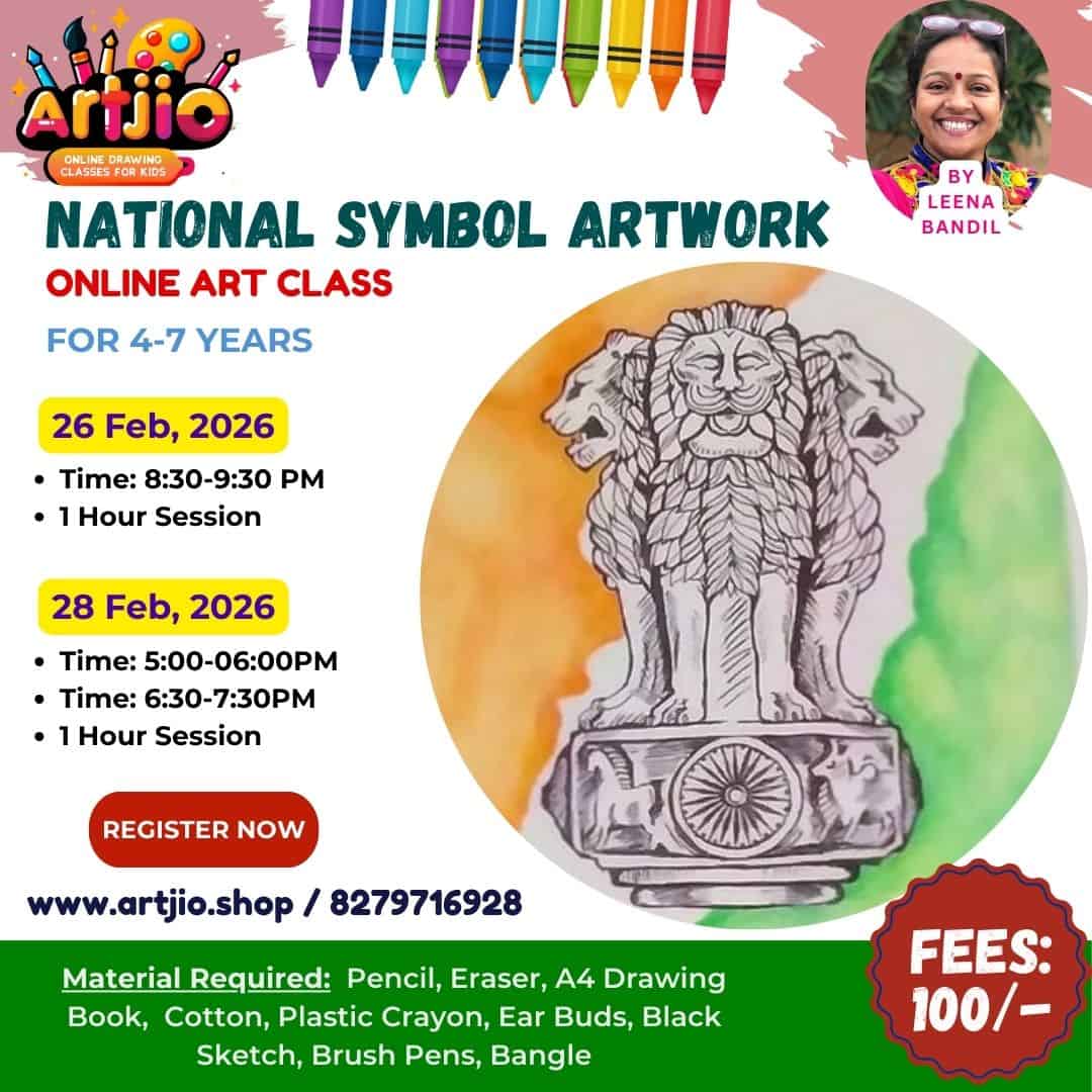 Specially designed for 4–7 years, this meaningful and creative art session introduces young learners to India’s National Symbol in a simple and engaging way. Through a step-by-step guided drawing process, children will create a beautiful artwork while understanding its importance. This session combines creativity with learning in a fun and age-appropriate manner. (Artwork shown in the poster is for reference only.)