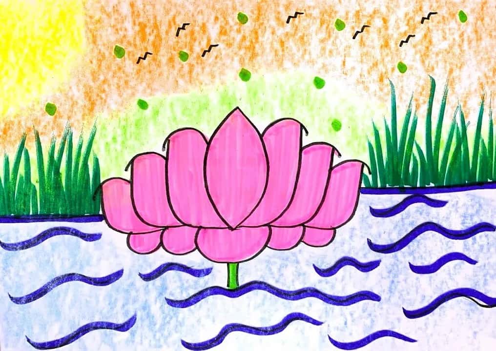 This serene lotus artwork beautifully portrays calmness, purity, and balance through bright yet soothing colours. The pink lotus blooms gracefully above gentle blue water, becoming the peaceful focal point of the composition. Bold outlines and smooth colouring give the flower a clear and confident form, while the flowing water lines create a rhythmic sense of movement. Lush green grass on both sides and a warm glowing sky enhance the natural setting. Small birds and floating dots add life and freshness to the scene. The harmonious blend of pinks, blues, greens, and warm tones reflects creativity and colour understanding. This artwork symbolises growth, positivity, and inner peace, expressed in a simple, child-friendly style that feels joyful, expressive, and visually soothing.