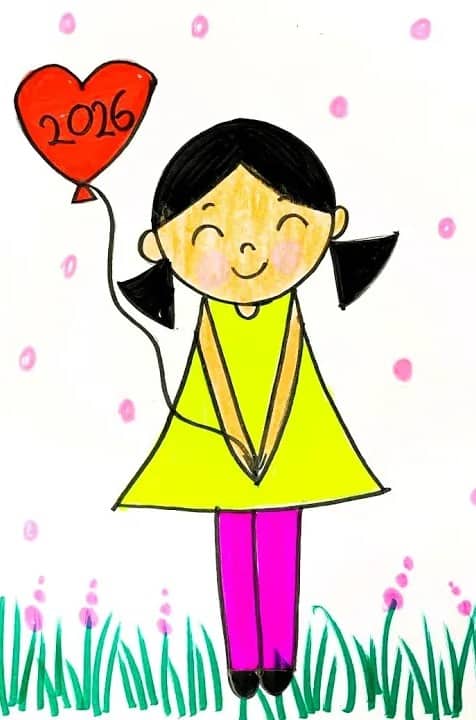 This cheerful artwork captures the innocence, hope, and joy of welcoming a brand-new year. The smiling little girl holding a heart-shaped balloon marked “2026” reflects positivity, dreams, and excitement for new beginnings. Simple lines, bright colours, and a gentle background make the artwork lively and child-friendly, allowing emotions to shine through minimal details.nnThrough this artwork, children explored expressing feelings through art, learned basic human proportions, and practiced clean outlining with confident colouring. The activity encouraged imagination, storytelling, and emotional expression while improving hand control and colour coordination. It also helped children understand how art can represent happiness, hopes, and celebration in a simple yet meaningful way—making creativity both joyful and expressive.
