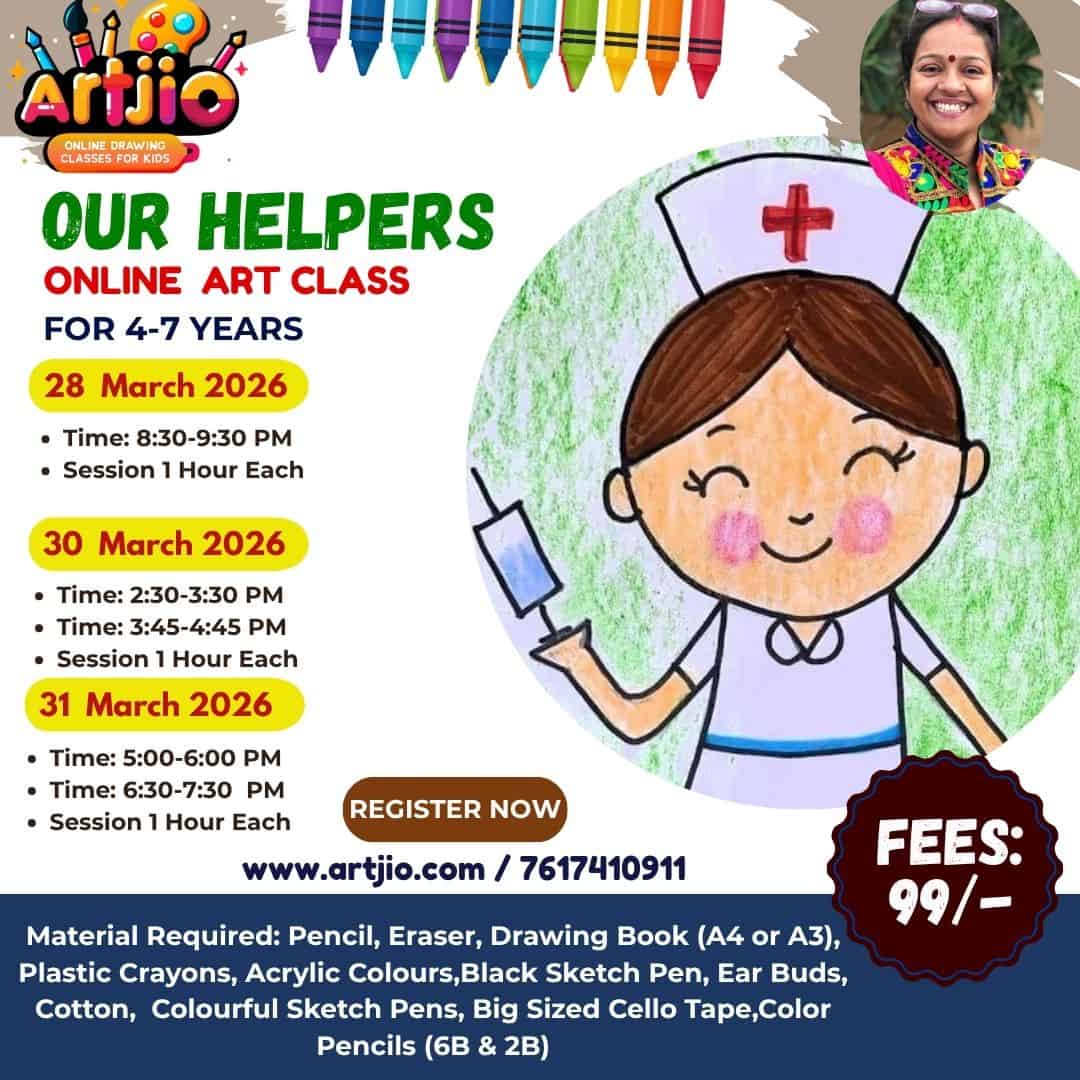 Specially designed for 4–7 years, this meaningful and engaging art session introduces little artists to the concept of community helpers through drawing. Through a guided step-by-step process, kids will create a cute nurse character while understanding the importance of helpers in our daily lives. This workshop combines creativity with awareness, helping children express gratitude through art. (Artwork shown in the poster is for reference only.)