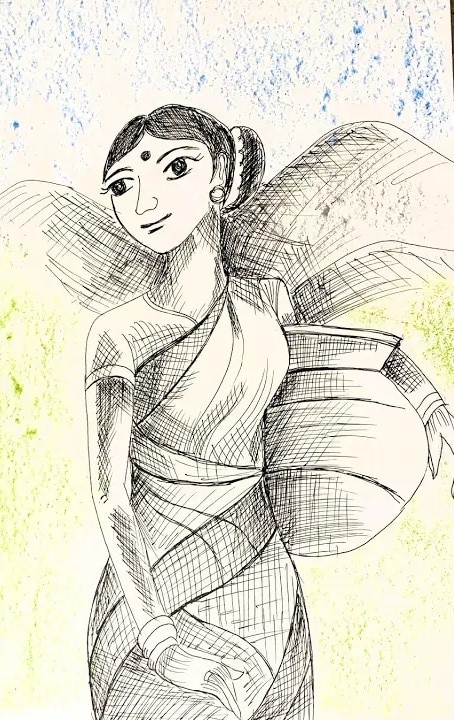 This graceful pen art artwork beautifully portrays a village woman carrying a water pot, reflecting strength, simplicity, and everyday rural life. Drawn using fine line strokes and cross-hatching techniques, the artwork highlights form, movement, and expression without heavy colours. The gentle posture, traditional attire, and calm facial expression bring a sense of dignity and balance to the composition. Soft textured shading in the background enhances depth while keeping the focus on the figure. This artwork helps children and learners understand human proportions, line control, and shading methods. It encourages patience, observation, and storytelling through minimalistic art, making it a wonderful example of expressive pen art rooted in culture and daily life.