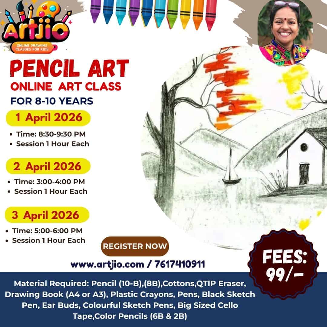 Specially designed for 8–10 years, this engaging art session introduces young artists to the beauty of pencil shading through a scenic landscape drawing. Through a guided step-by-step process, kids will create a peaceful village scene with trees, house, and mountains while learning shading and depth techniques. This workshop helps children understand light, shadow, and composition in a simple and creative way. (Artwork shown in the poster is for reference only.)