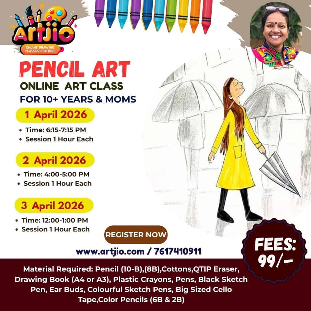 Specially designed for 10+ years & moms, this expressive and engaging art session introduces participants to the beauty of pencil shading through a meaningful rainy-day scene. Through a guided step-by-step process, learners will create a graceful character walking with an umbrella while understanding depth, shading, and composition. This workshop blends creativity with emotions, helping participants express mood through art. (Artwork shown in the poster is for reference only.)