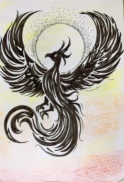 This stunning artwork of a phoenix symbolizes resilience, rebirth, and strength. Rising majestically with its wings spread wide, the mythical bird represents transformation and the power to emerge stronger from adversity. The intricate strokes of black ink highlight its elegance and fierce spirit, while the glowing halo behind it signifies enlightenment and renewal. The phoenix is a timeless symbol of hope, inspiring us to overcome challenges and rise from setbacks with renewed energy. This masterpiece beautifully captures the essence of endurance and determination, reminding us that every ending leads to a new beginning, just like the legendary phoenix’s rebirth.
