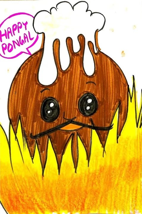 This vibrant and joyful illustration celebrates the South Indian harvest festival of Pongal with a fun, kid-friendly twist! The central character is a cute, animated Pongal pot with big sparkly eyes, a playful mustache, and a cheerful expression. Overflowing with rice and milk, the pot symbolizes abundance and prosperity. Surrounded by bright yellow flames, it captures the traditional Pongal cooking ritual. A festive pink speech bubble joyfully declares “Happy Pongal,” adding to the celebratory mood. Hand-drawn with warm, rich colors and cartoon-style charm, this artwork is perfect for children and families. It beautifully blends cultural tradition with fun, making it both engaging and educational for young audiences.