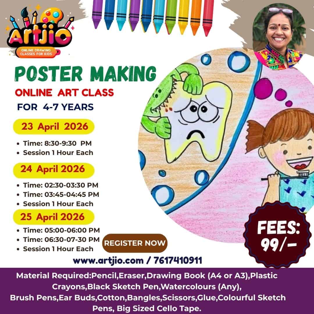 Specially designed for 4–7 years, this fun and engaging art session introduces little artists to the world of creative poster making. In this guided workshop, kids will create a meaningful and colorful poster while learning how to express ideas through drawings. With playful elements like cute characters, bubbles, and storytelling visuals, children will enjoy designing their own creative artwork. (Artwork shown in the poster is for reference only.)