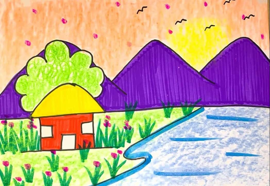 This colourful artwork beautifully captures a peaceful countryside landscape filled with nature and serenity. The young artist has drawn a small cozy house with a bright yellow roof and red walls, surrounded by green plants and blooming flowers. Behind the house, tall purple mountains create a stunning background, while the glowing sun rises from behind the hills, spreading warm light across the sky. Birds flying above add a lively touch to the scene. A calm blue river flowing beside the house makes the landscape look relaxing and refreshing. The bright colours and simple shapes make the artwork cheerful and imaginative. Through this drawing, children express their creativity while learning to observe nature, landscapes, and colours in a fun and artistic way. 🌄🏡🌸✨
